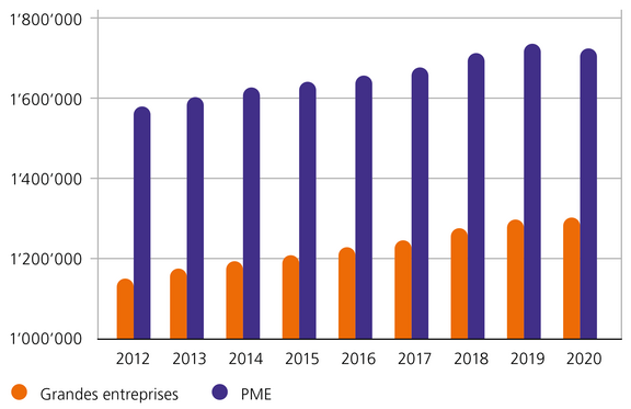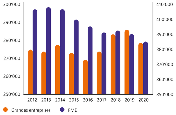 Le graphique illustre l’évolution du nombre d’équivalents plein temps (EPT) dans l’industrie manufacturière pour les grandes entreprises (orange, axe vertical gauche) et pour les PME (violet, axe vertical droit) pour la période 2012–2020. Pour les grandes entreprises, après une évolution positive entre 2016 et 2019, on observe un recul des EPT pendant la première année de la pandémie de coronavirus (2020). Pourtant, depuis 2012, les EPT dans les grandes entreprises ont augmenté à 3528 EPT, soit une progression de 1 %. Dans les PME, on enregistre une perte constante d’EPT qui s’est accélérée en 2020 : le nombre des EPT dans les PME de l’industrie manufacturière a reculé de 21 437 depuis 2012. Ainsi, un poste sur 20 a été supprimé. Sur toutes les tailles d’entreprises, une perte de 17 909 EPT a été enregistrée, ce qui correspond à un recul de 3 % par rapport à 2012.