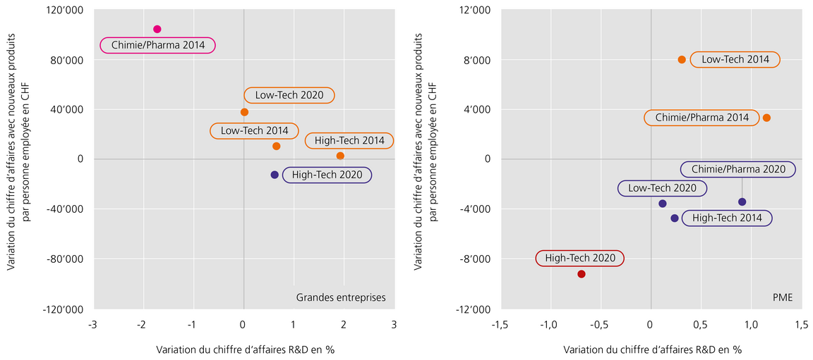 La présentation sous forme de portefeuille illustre l’évolution des tendances pour les grandes entreprises (graphique de gauche) et les PME (graphique de droite) pour la période 1997–2020 au niveau des catégories d’industrie. Sont indiqués sur l’axe horizontal les coûts en tant que dépenses de R&D rapportées au chiffre d’affaires ; sont indiqués sur l’axe vertical les bénéfices en tant que chiffre d’affaires réalisé avec de nouveaux produits par personne employée. Sont représentées les variations des périodes 2010–2014 (2014) et 2016–2020 (2020) par rapport à la période 1997–2004 en pour cent des valeurs d’origine ; pour des raisons de protection des données, les chiffres 2020 pour les grandes entreprises de la catégorie Chimie/Pharma font défaut. Les valeurs négatives signifient que les coûts et / ou les bénéfices ont été inférieurs à ceux de la période de référence ; les valeurs positives signifient une augmentation par rapport à la période de référence. Pour les grandes entreprises de la catégorie Low-Tech, la courbe évolue vers une augmentation des bénéfices bien que les dépenses relatives aient reculé depuis la période de référence. Pour les grandes entreprises de la catégorie High-Tech, un recul se voit sur les deux axes ; les entreprises ont moins investi dans la R&D, et le chiffre d’affaires réalisé avec de nouveaux produits a baissé. Les coûts des PME de toutes les catégories ont diminué depuis 2014 ; les bénéfices ont reculé et ont baissé, pour toutes les catégories, au-dessous des valeurs de la période de référence.